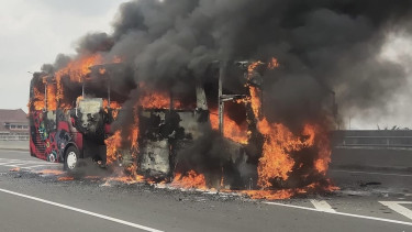 Jakarta - Bus pariwisata terbakar di Tol Wiyoto Wiyono arah Tanjung Priok, Jakarta Utara, Rabu 12 Juni 2024. Diduga penyebabnya karena ban pecah.