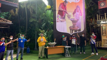 Terlihat, SBY memakai sweater warna kuning bertuliskan Lavani yang merupakan klub voli. Mantan Ketua Umum Partai Demokrat ini juga memegang piring sebelah tangan kiri, dan gelas sebelah kanannya.
