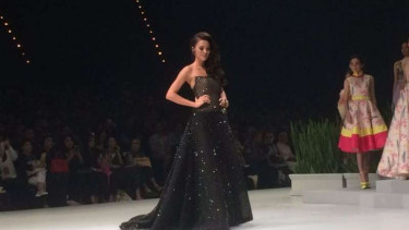 Dalam sesi peragaan busana, Keke sapaan akrabnya, mengenakan gaun berwarna hitam bertahtakan ratusan kristal yang menurut Ivan beratnya mencapai kurang lebih 10 kilogram.