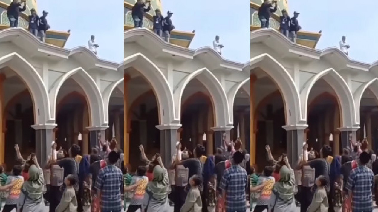 Dalam unggahan video viral itu memperlihatakan seorang pria dari atas masjid membagikan-bagikan uang dengan cara menghambur-hamburkan uang kertas.