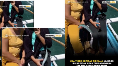 Terlihat di dalam video dua orang emak-emak sedang berada di atas perahu yang berlayar. Salah satu emak-emak itu memakai jaket hitam, berbaju hijau tosca dan bercelana panjang sedang menggenggam HP.
