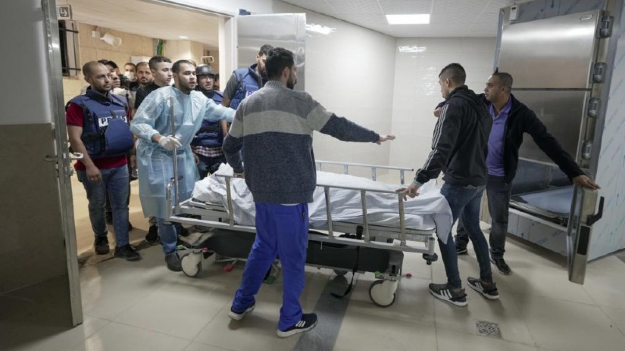 Para petugas medis dan jurnalis membawa jenazah Shireen Abu Akleh ke rumah sakit di Tepi Barat.