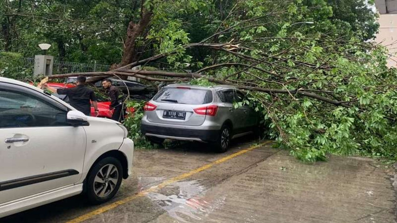 Pohon tumbang di Kalibata City akibat hujan deras yang mengguyur Jakarta