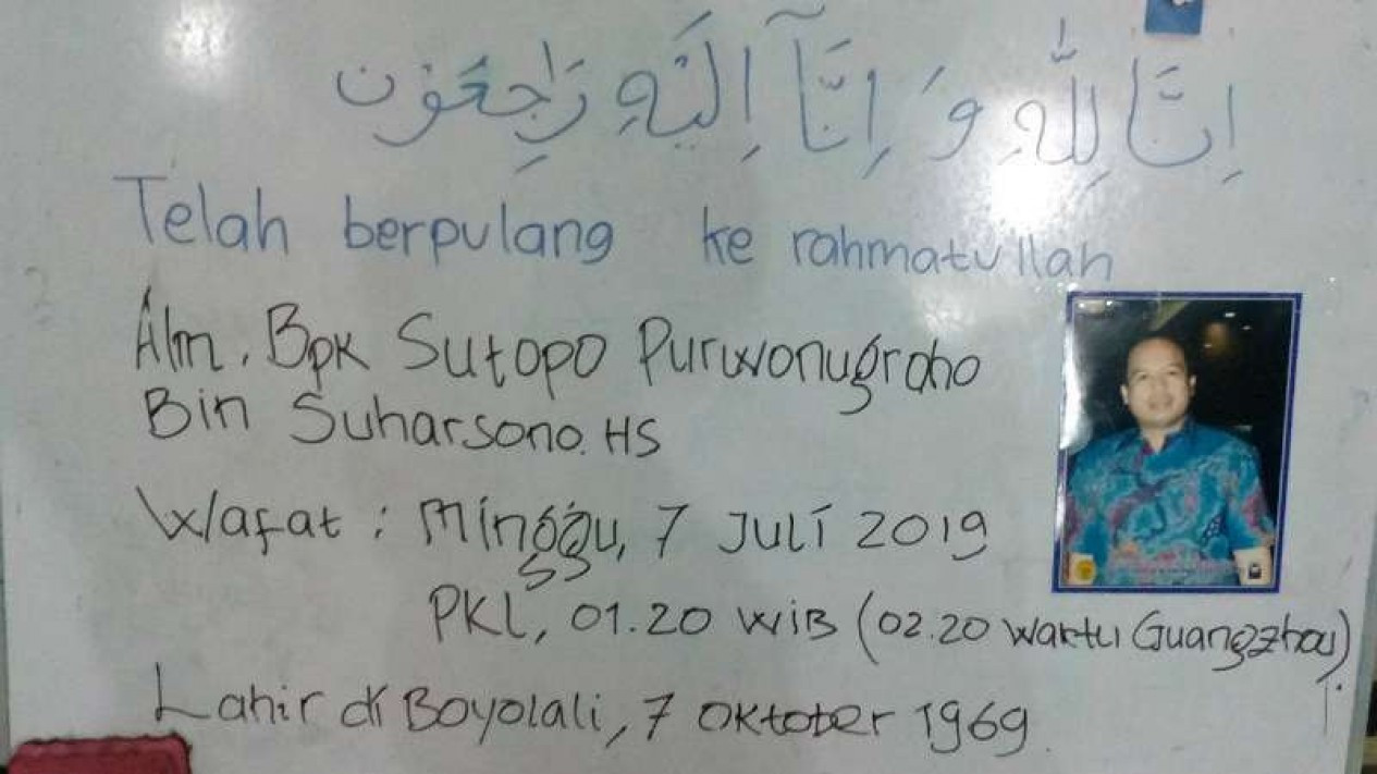 Untuk diketahui, Sutopo menghembuskan nafas terakhirnya pada Minggu dinihari pukul 2.20 waktu Guangzhou, China atau 01.00 WIB. Sutopo Purwo Nugroho Bin Suwarsono HS meninggal dunia akibat kanker paru-paru.