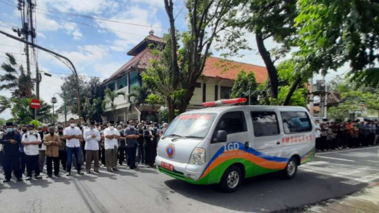 VIVA - Ratusan pelayat mengikuti salat jenazah untuk Pimpinan Pusat Majelis Tafsir Alquran (MTA) Ustaz Ahmad Sukina di halaman Kantor Pusat MTA di Solo, Kamis, 25 Februari 2021. Selama pelaksanaan salat tersebut, jenazah tetap berada di dalam mobil amnbulans.