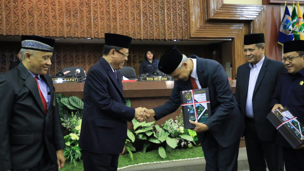 Penyerahan hasil pemeriksaan diterima oleh Gubernur Jawa Tengah Ganjar Pranowo dan Wakil Ketua DPRD Jawa Tengah Sukirman, saat Rapat Paripurna Masa Persidangan Tahun Ketiga Tahun Sidang 2022-2023 di Gedung DPRD Jawa Tengah, Kota Semarang.