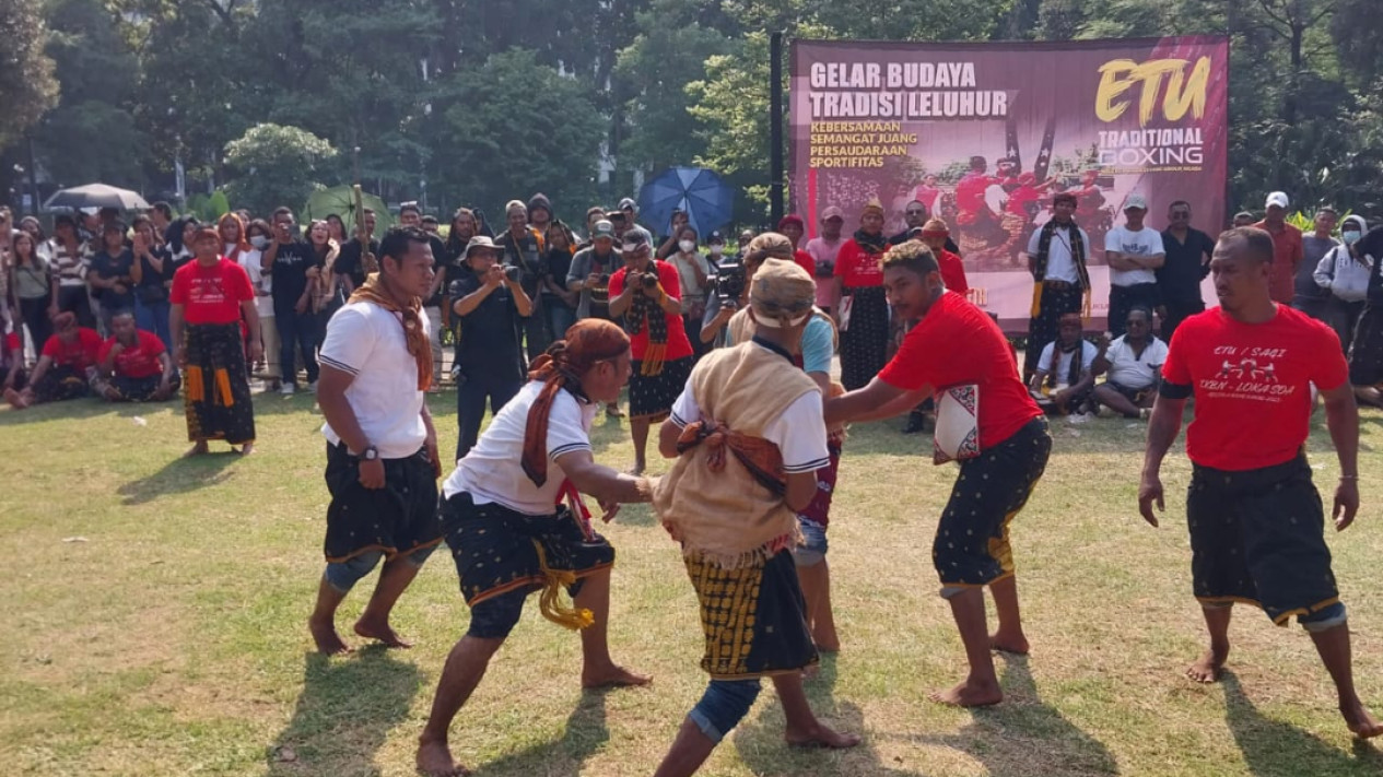 Jakarta – Masyarakat Nusa Tenggara Timur (NTT) yang berada di Jabotabek menggelar tradisi budaya leluhur etu atau tinju tradisional. Etu biasa dipentaskan setiap tahun pada musim kemarau atau pada masa senggang sesudah panen. Alat tinjunya bukan dengan sarung tinju namun dengan tali ijuk yang dipilin menjadi sebuah gumpalan.Â