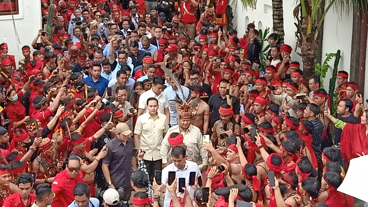 Pontianak - Momen langka terjadi saat capres 02, Prabowo Subianto menghadiri Bahaupm Bide Bahana (Silaturahmi) bersama ribuan Pasukan Merah Tariu Borneo Bangkule Rajakng (TBBR) di Pontianak, Kalimantan Barat, Sabtu (20/1).Â