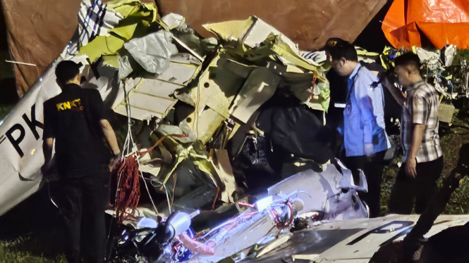 Kondisi badan pesawat terpantau hancur. Bahkan bagian sayap nampak patah akibat terhantam tanah.