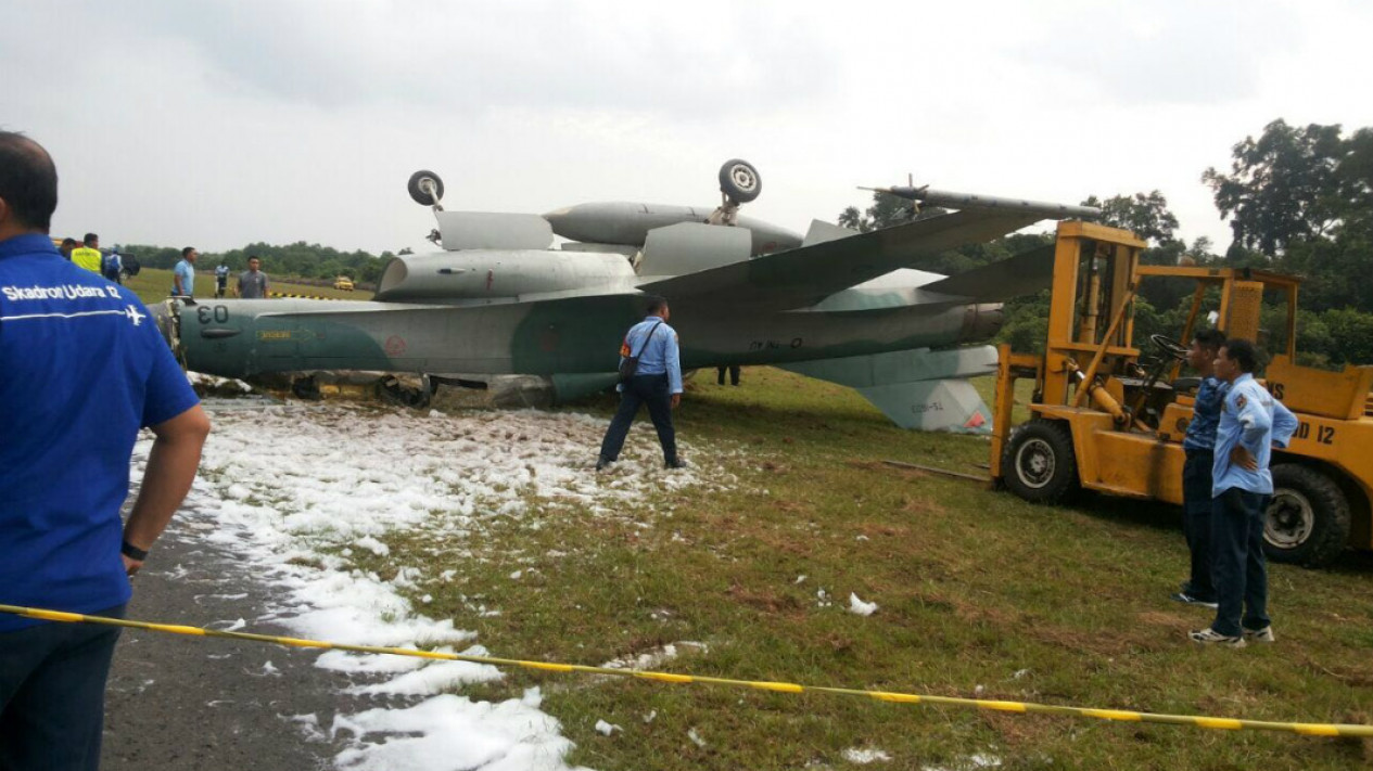 Pesawat tempur F-16 tipe TS 1603 milik TNI Angkatan Udara tergelincir hingga terbalik di ujung landasan pacu Lanud Roesmin Nurjadin pada pukul 17.25 WIB, Selasa, 14 Maret 2017.