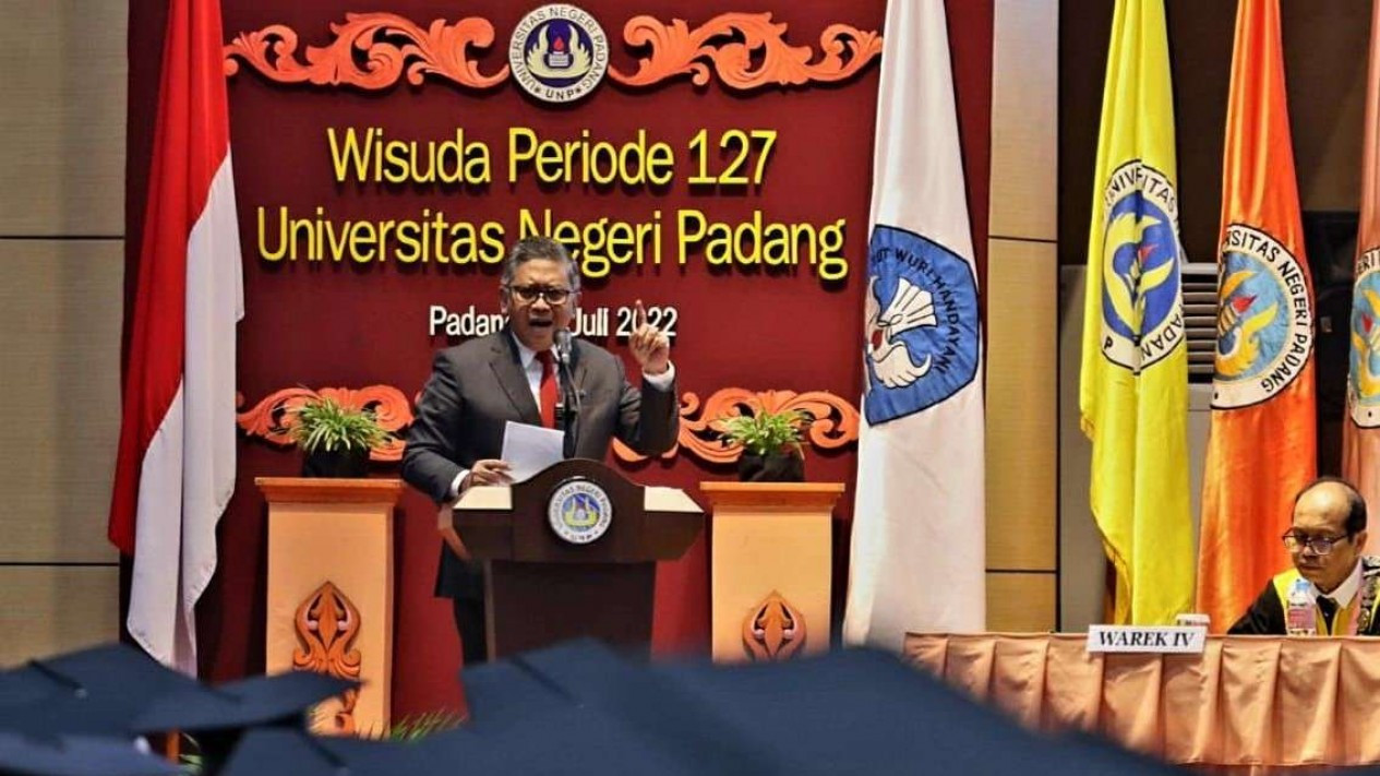 VIVA – Sekjen DPP PDI Perjuangan Hasto Kristiyanto, menyampaikan orasi ilmiah dalam wisuda mahasiswa Universitas Negeri Padang (UNP), Minggu 3 Juli 2022). Hasto adalah Doktor Ilmu Pertahanan dan Geopolitik.