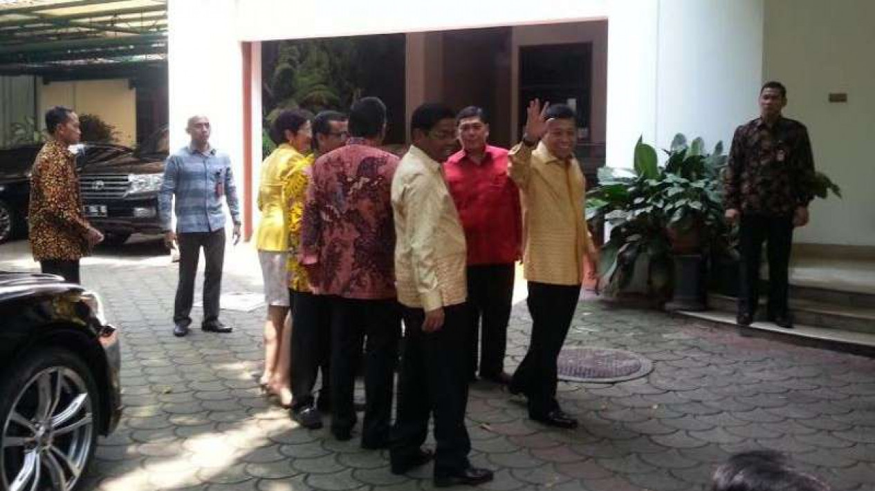 Novanto yang datang memakai batik kuning itu tiba di kediaman Mega pada sekitar pukul 13.15 WIB. Dia tampak ditemani sejumlah jajaran pengurus Golkar di antaranya Idrus Marham, Nurul Arifin serta Yahya Zaini.
