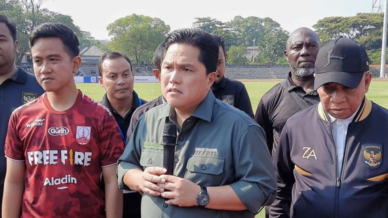 SOLO – Ketua Umum PSSI Erick Thohir meninjau seleksi pemain Timnas U-17 di Stadion Sriwedari, Solo, Minggu, 23 Juli 2023. Seleksi yang dilakukan di sejumlah kota di Indonesia itu, mantan Presiden Inter Milan itu memastikan tidak ada pemain titipan dalam seleksi pemain Timnas U-17.
