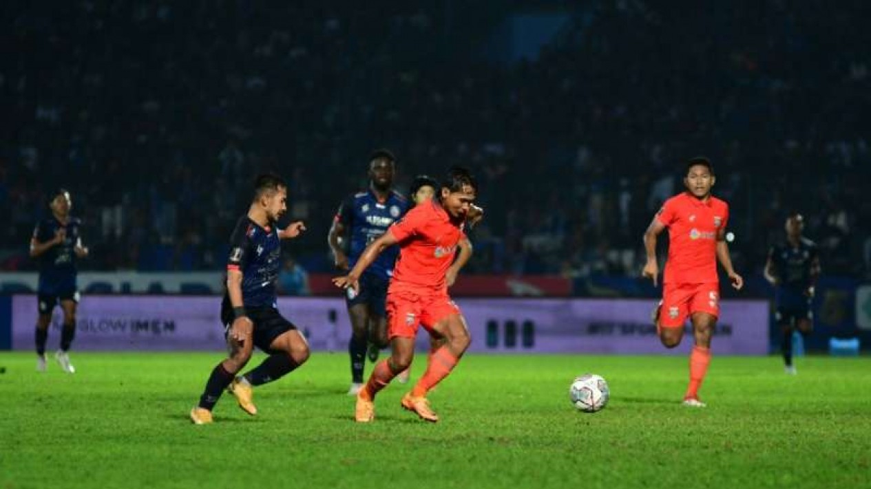 Pemain Arema FC Gian Zola berduel dengan Hendro Siswanto