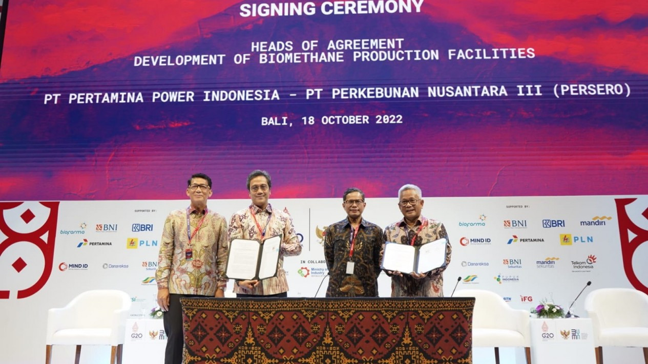 Penandatanganan kerja sama hulu ke hilir penyediaan Compressed Biomethane antara Pertamina NRE (PNRE), Subholding Gas Pertamina melalui afiliasinya, Pertagas Niaga, serta PT Perkebunan Nusantara III (Persero) (PTPN III).