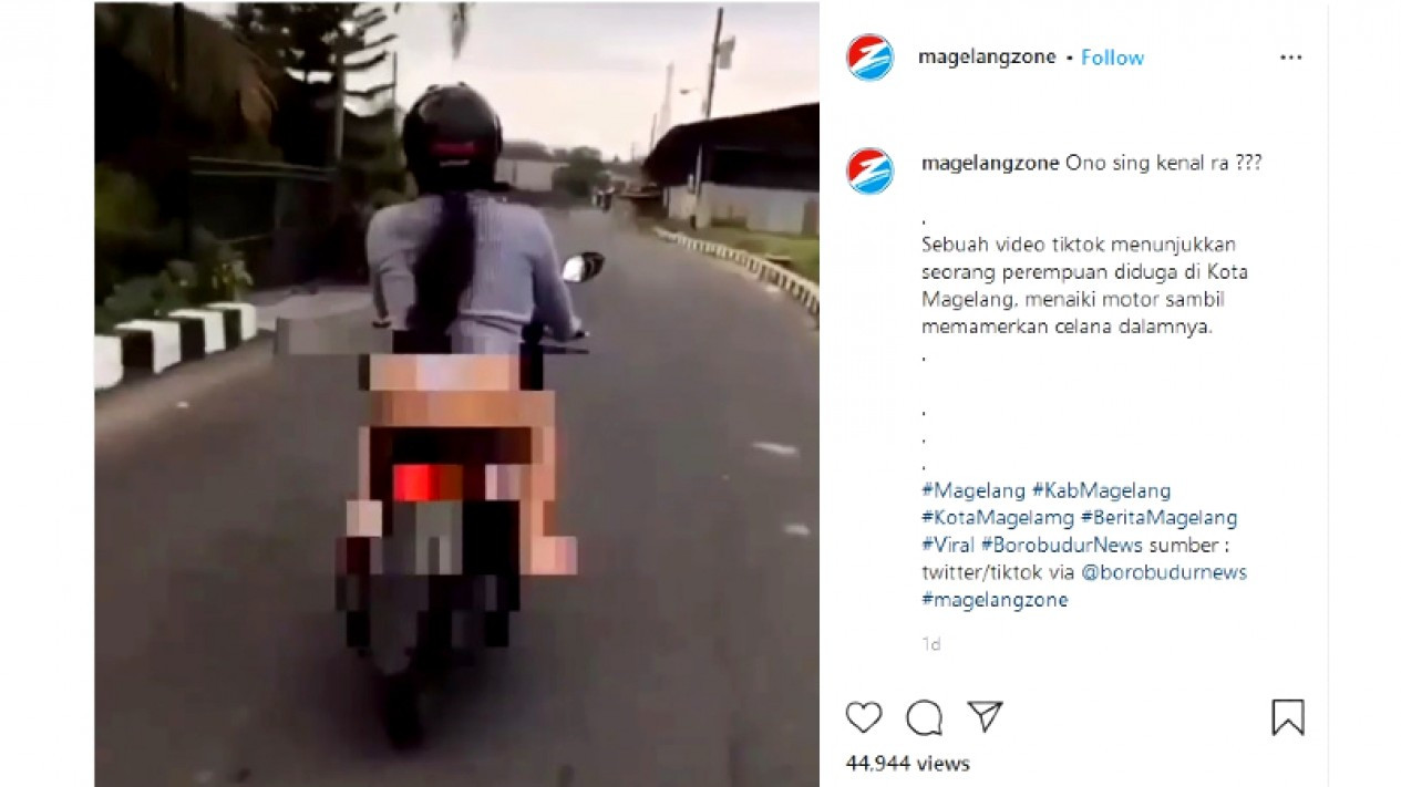 "Ono sing kenal ra ???” Sebuah video tiktok menunjukkan seorang perempuan diduga di Kota Magelang, menaiki motor sambil memamerkan celana dalamnya," tulis unggahan itu.