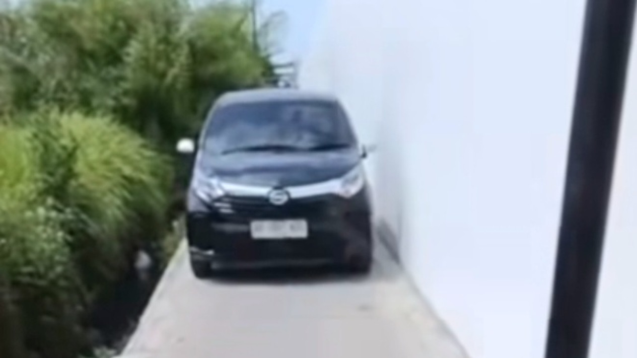 Terlihat dalam tayangan, mobil Daihatsu Sigra telah melewati jalan yang cukup panjang di gang kecil tersebut, namun saat berada di ujung jalan dan ingin keluar di jalan sempit, terhalang oleh sebuah tiang listrik.