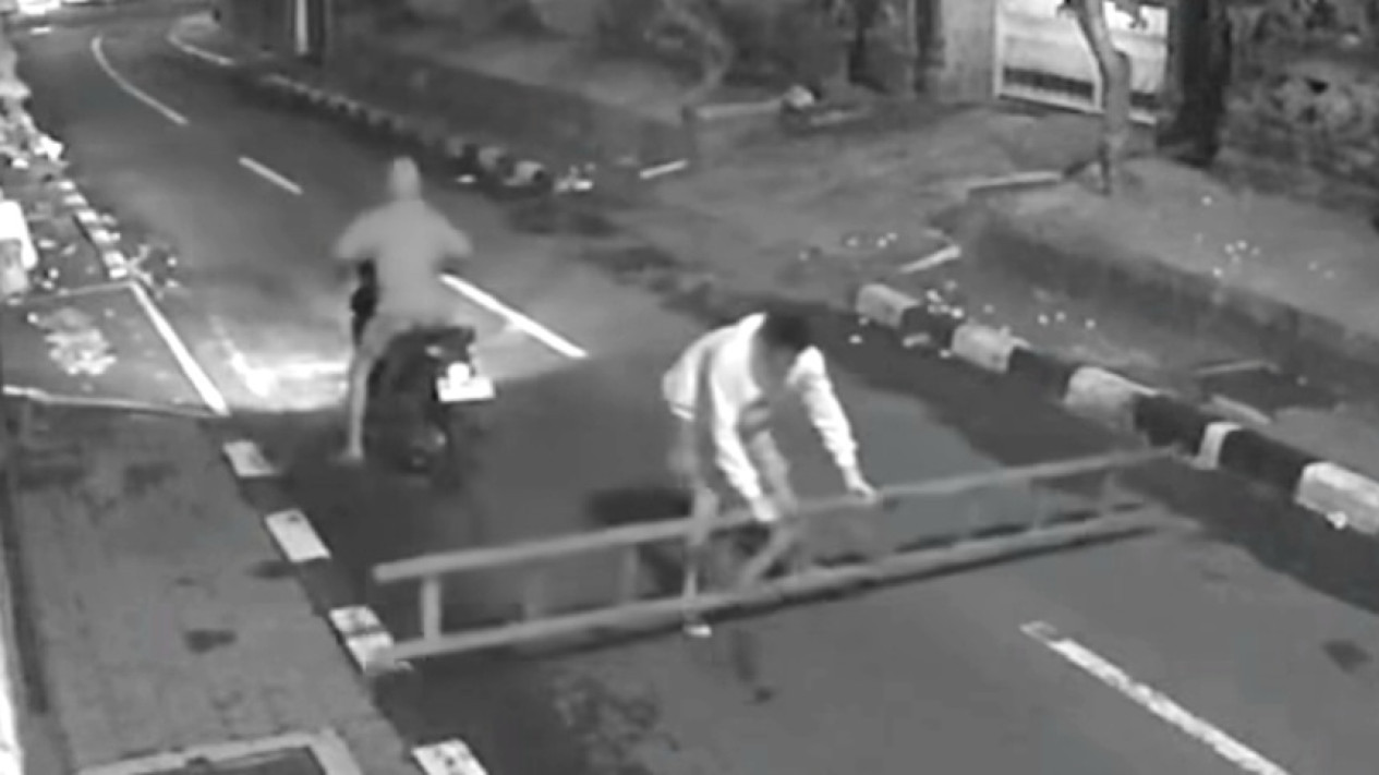 Sesaat, terdapat pengendara motor yang melewati jalan tersebut dengan kecepatan tinggi hingga tidak melihat keberadaan tangga yang berada di tengah jalan tersebut.