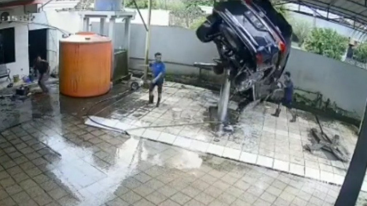 Dalam tayangan itu terlihat Fortuner berwarna hitam sedang berusaha diangkat menggunakan hidrolik X untuk membersihkan kolong mobil. Tapi sayangnya, saat proses pengangkatan mobil sudah terlihat miring.