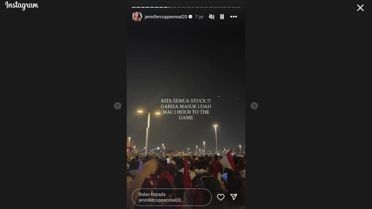 Lewat unggahannya, Jennifer Coppen juga membagikan kondisi terkini di mana banyak suporter yang mulai kehilangan kendali karena panik menjelang pertandingan.