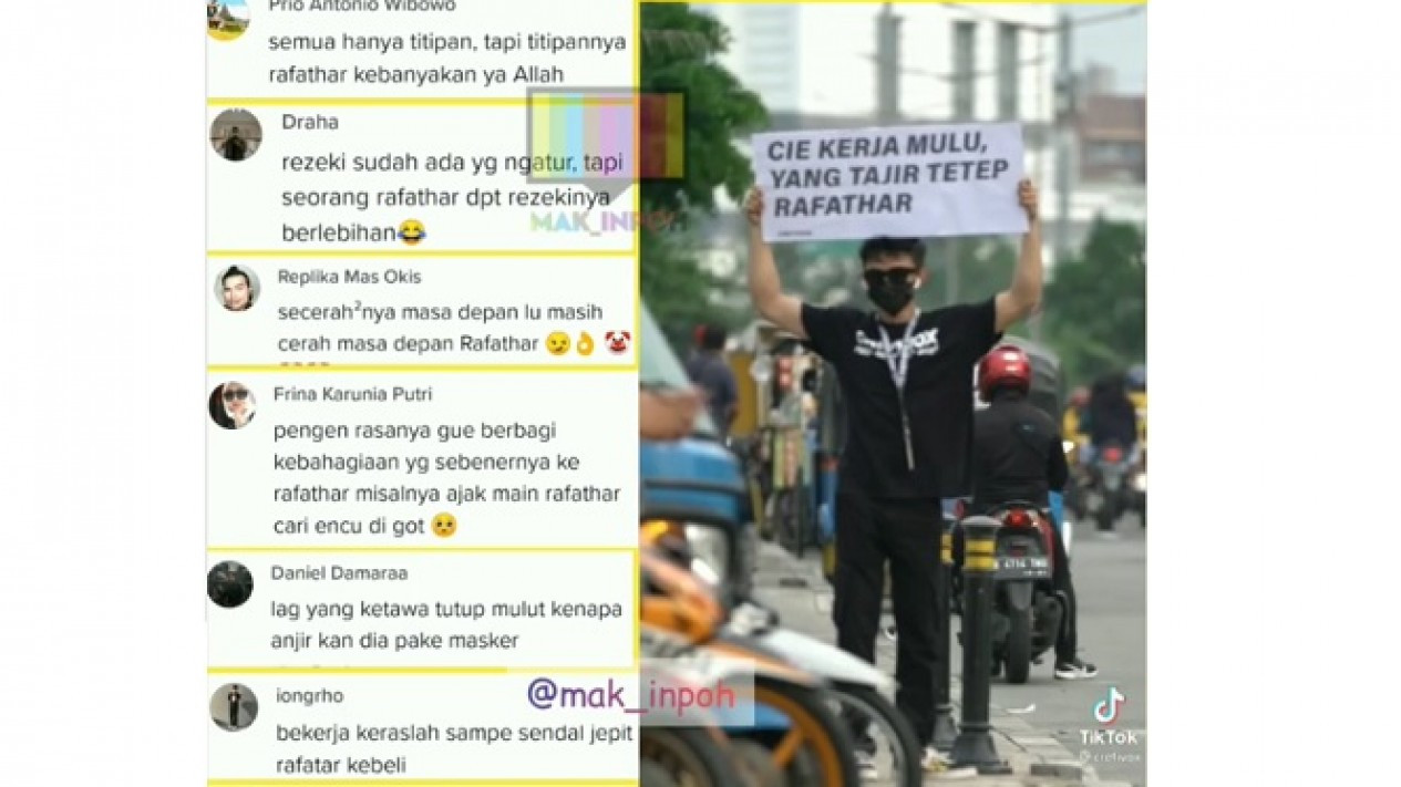 Seperti baru-baru ini ada seorang pria yang menghebohkan dunia maya dengan aksi gokilnya. Di mana seorang pria yang mengenakan kaos hitam tersebut berdiri dengan membawa papan putih yang bertuliskan "Cari Kerja Mulu yang Tajir Tetep Rafathar".